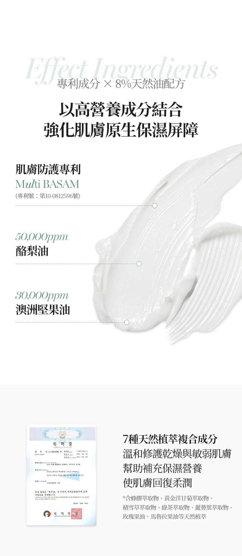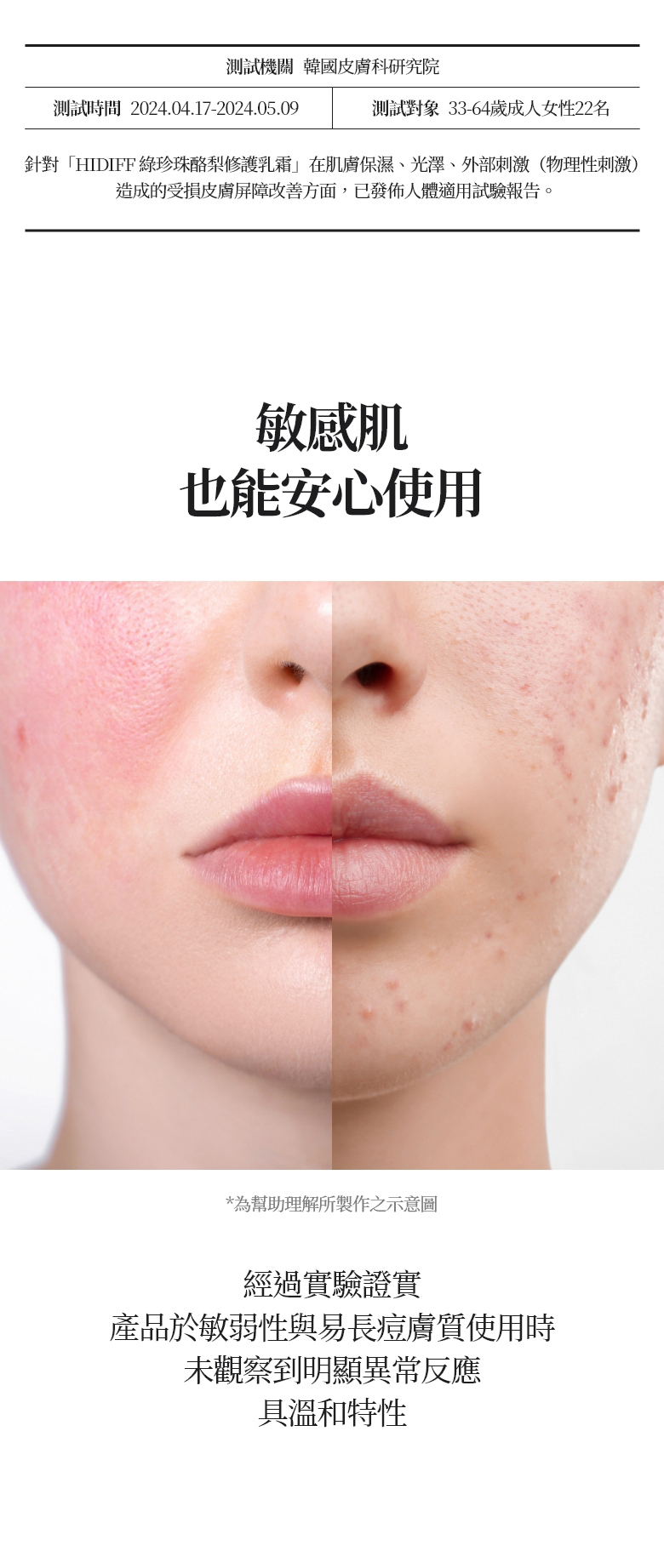 組合主要功效:穩定、舒緩肌膚,預防/降低泛紅、長痘,等肌膚敏感問題。